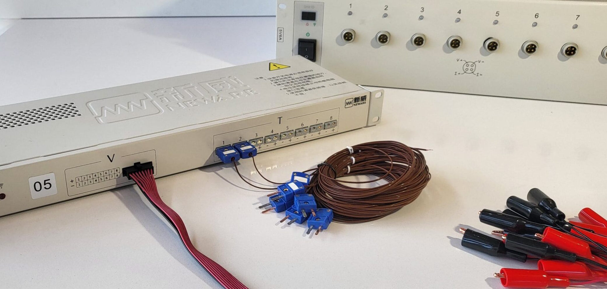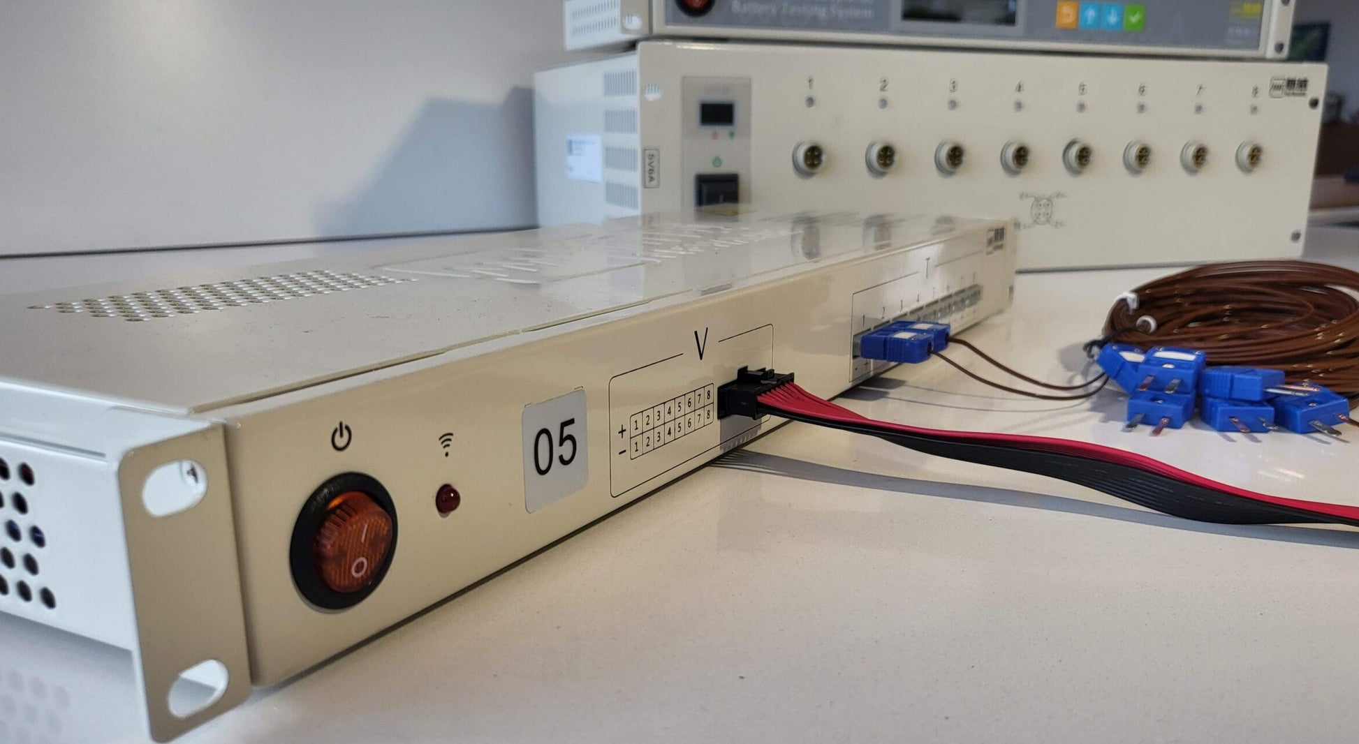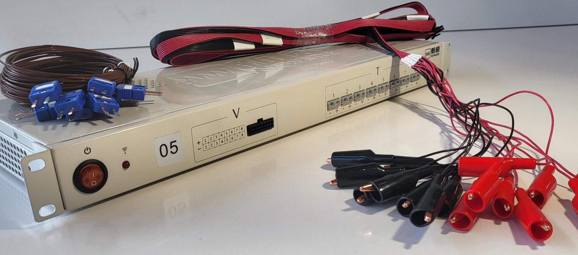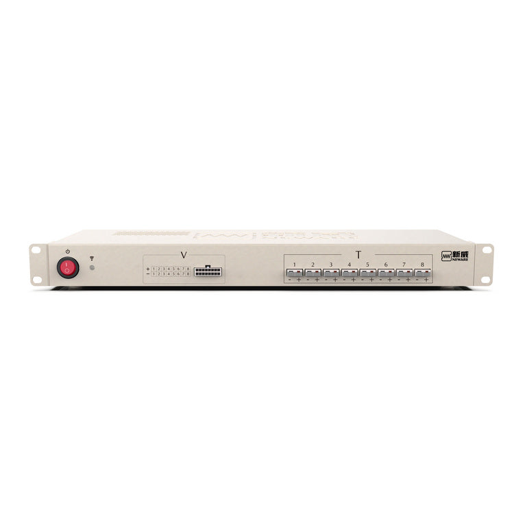 The AUX unit is connected with the control unit. With a few steps in the battery tester software individual channels of the AUX unit can easily be connected with a specific battery tester channel whereby AUX voltage and/or temperature is recorded and saved together with battery test data. Unit is comes ready-to-use with 8 thermocouples and 8 crocodiles wires.