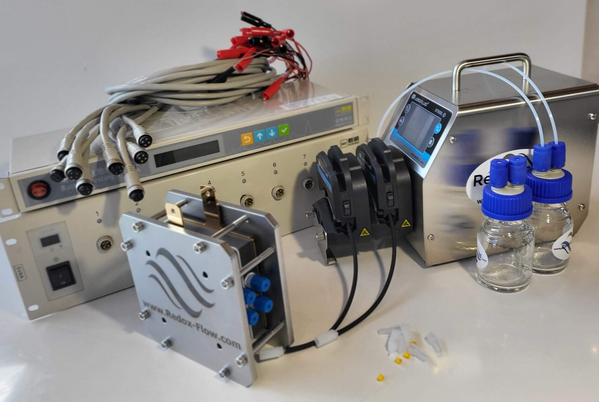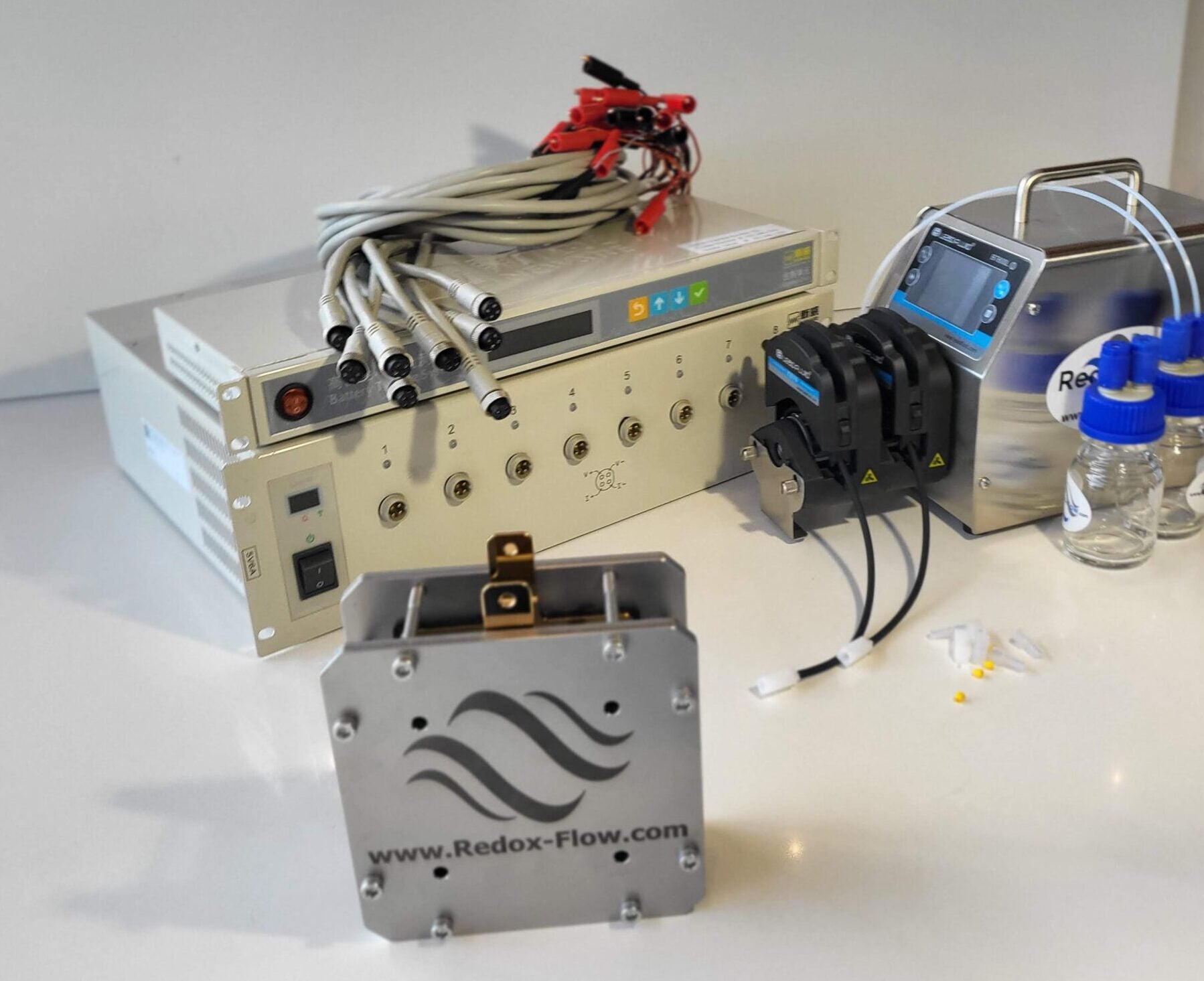 Complete Redox Flow Battery test cell setup for test of vanadium flow batteries or other battery chemistries