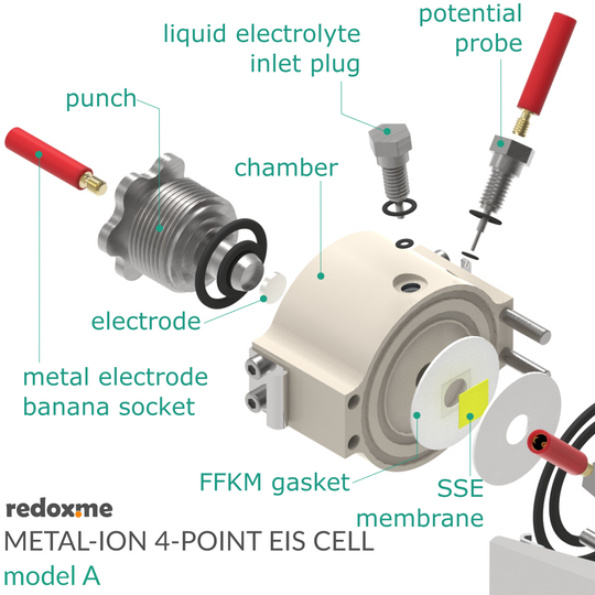 Metal-ion 4-point EIS is typically used to study solid-liquid electrolyte interphase in metal-ion batteries. The assembling of the cell must take place inside the glove box filled up with an inert gas. This requirement is due to the instability of Lithium, Sodium, and Potassium in ambient atmosphere. However, the measurements may be carried out inside or outside the glove box. Liquid electrolyte should be inserted into the cell using a syringe with a long needle reaching the bottom of the chamber. The removal of the electrolyte from the cell should be handled the same way. Metallic Lithium, Sodium, and Potassium electrodes are not included in this setup and should be arranged from elsewhere. The recommended foil thickness is 1.5 mm.