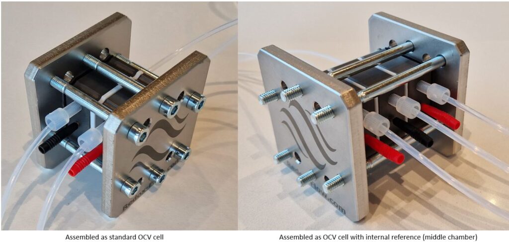 OCV cell with internal reference potential : In this configuration the cell has the same capabilities as the standard OCV cell with the only difference that an additional half cell in the setup allows measurement of all potentials relative to a reference potential. Drawing below explains the working principles.