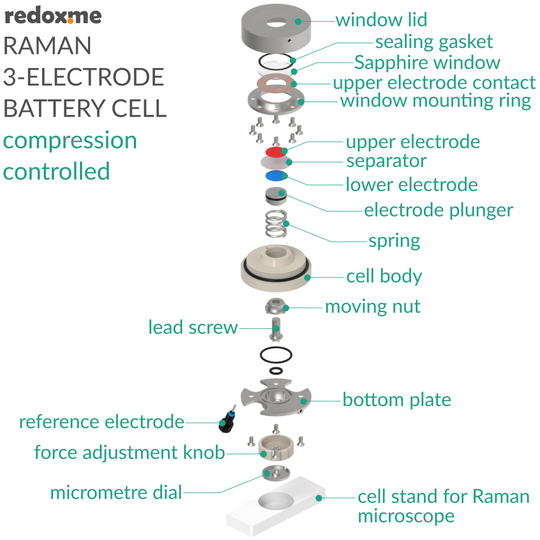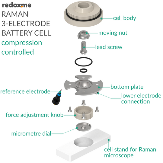 This Three-Electrode Battery Cell for Raman spectroscopy is a high-quality, gas-tight assembly designed for the most discerning of researchers. It combines the ability to perform high-quality reproducible electrochemical measurements of battery and supercapacitor materials with in situ Raman spectroscopy characterization. The main features of the cell are: (i) three-electrode setup, (ii) adjustable compression force with high accuracy, (iii) gas-tight construction, (iv) large viewing area (14 mm dia.) (v) very easy assembly, and (vi) low profile – total height < 33 mm.